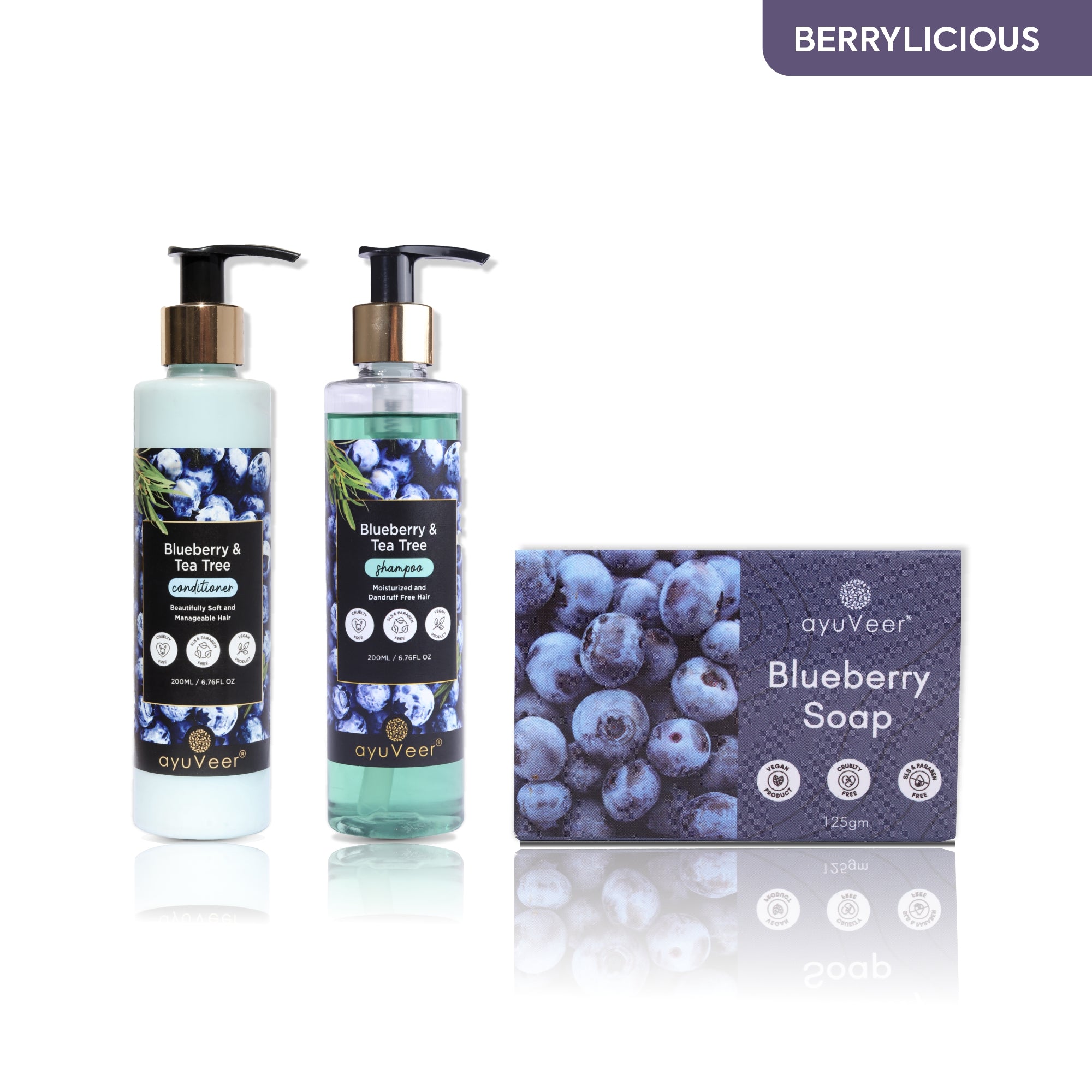 Blueberry & Tea Tree Conditioner: Locks in moisture and leaves your hair smooth and tangle-free. Tea tree’s antibacterial properties help maintain scalp health while blueberry oil adds shine.