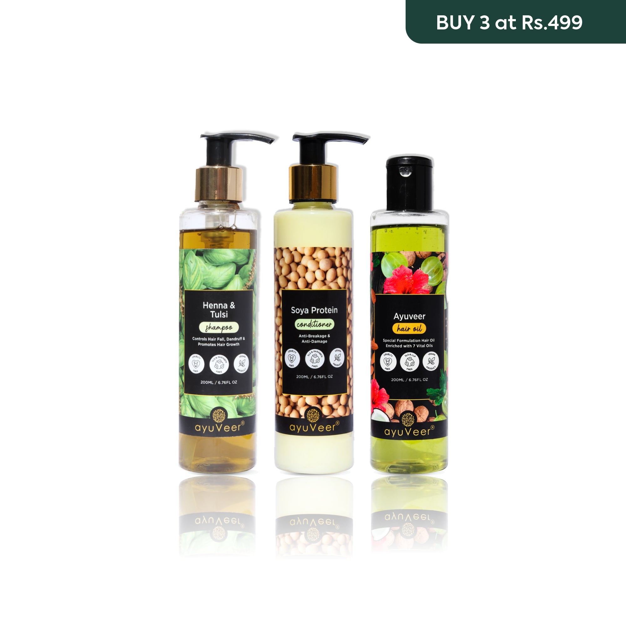 | Henna Tulsi Shampoo: Gently cleanses while the goodness of henna and tulsi helps strengthen hair and reduce dandruff. Soya Protein Conditioner: Nourishes hair with protein, leaving it smooth, manageable, and frizz-free. Ayuveer Hair Oil: A revitalizing blend that strengthens hair, adds shine, and prevents hair fall, making hair healthier and stronger over time. |