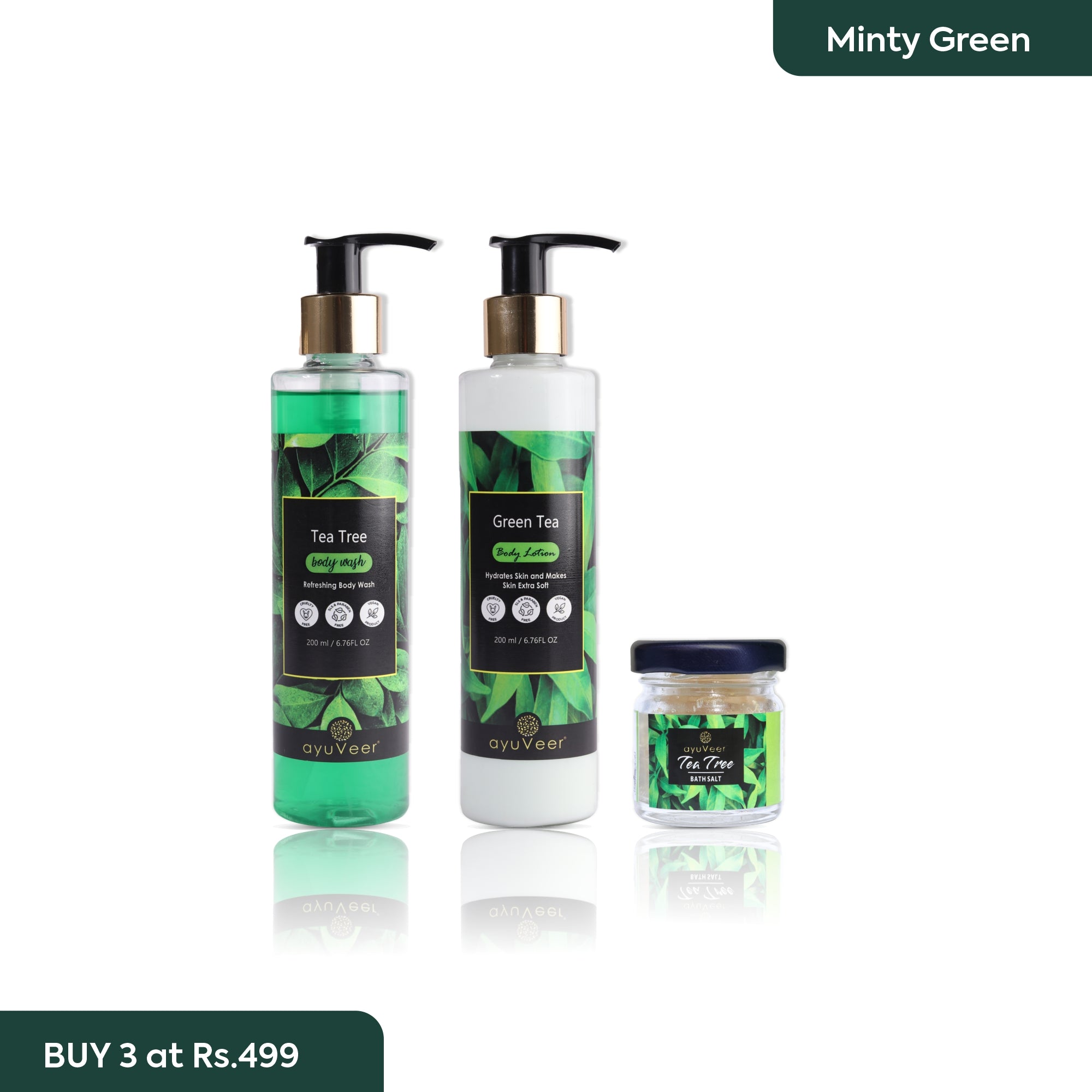 Tea Tree Bodywash: Cleanses, detoxifies, and refreshes the skin, with the antibacterial properties of tea tree oil. Green Tea Lotion: Nourishes and moisturizes the skin while offering antioxidant protection with green tea extracts. Mini Tea Tree Bath Salt: A calming and detoxifying soak that relaxes your muscles while invigorating your skin with tea tree oil. |
