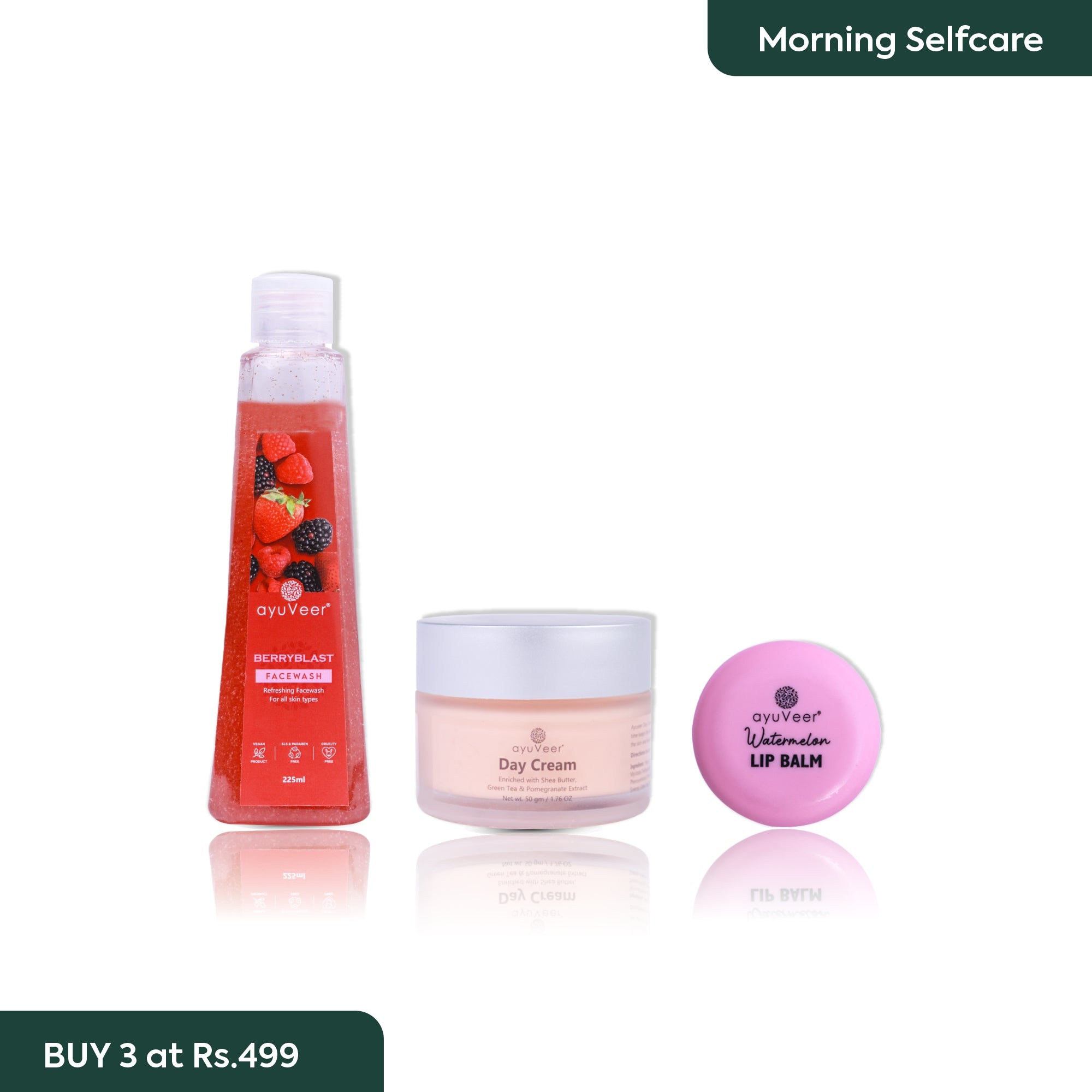 Day Cream: Protects and hydrates the skin, keeping it fresh, smooth, and ready to face the day with a natural glow. Berryblast Facewash: Deeply cleanses and brightens the face, while helping to reduce inflammation for smooth, youthful skin. Watermelon Lip Balm: Keeps lips soft and hydrated, with a delicious watermelon scent that also protects against dryness. |